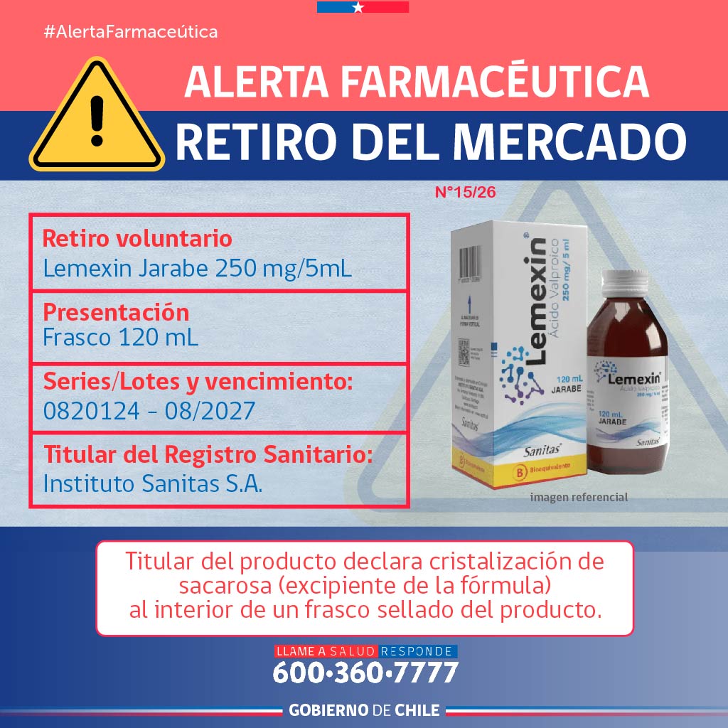 En este contexto, la autoridad sanitaria informó una Alerta Farmacéutica por Lemexin, un medicamento utilizado en el tratamiento de la epilepsia, luego de detectar una alteración en su composición, lo que derivó en el retiro voluntario de un lote del producto.