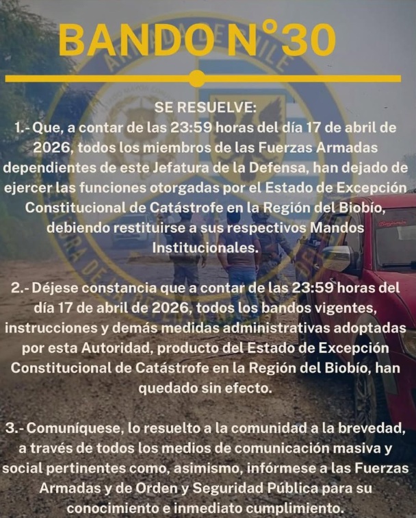 En un segundo punto, agregó: "déjese constancia que a contar de las 23:59 horas del día 17 de abril de 2026, todos los bandos vigentes, instrucciones y demás medidas administrativas adoptadas por esta Autoridad, producto del Estado de Excepción Constitucional de Catástrofe en la Región del Biobío, han quedado sin efecto".
